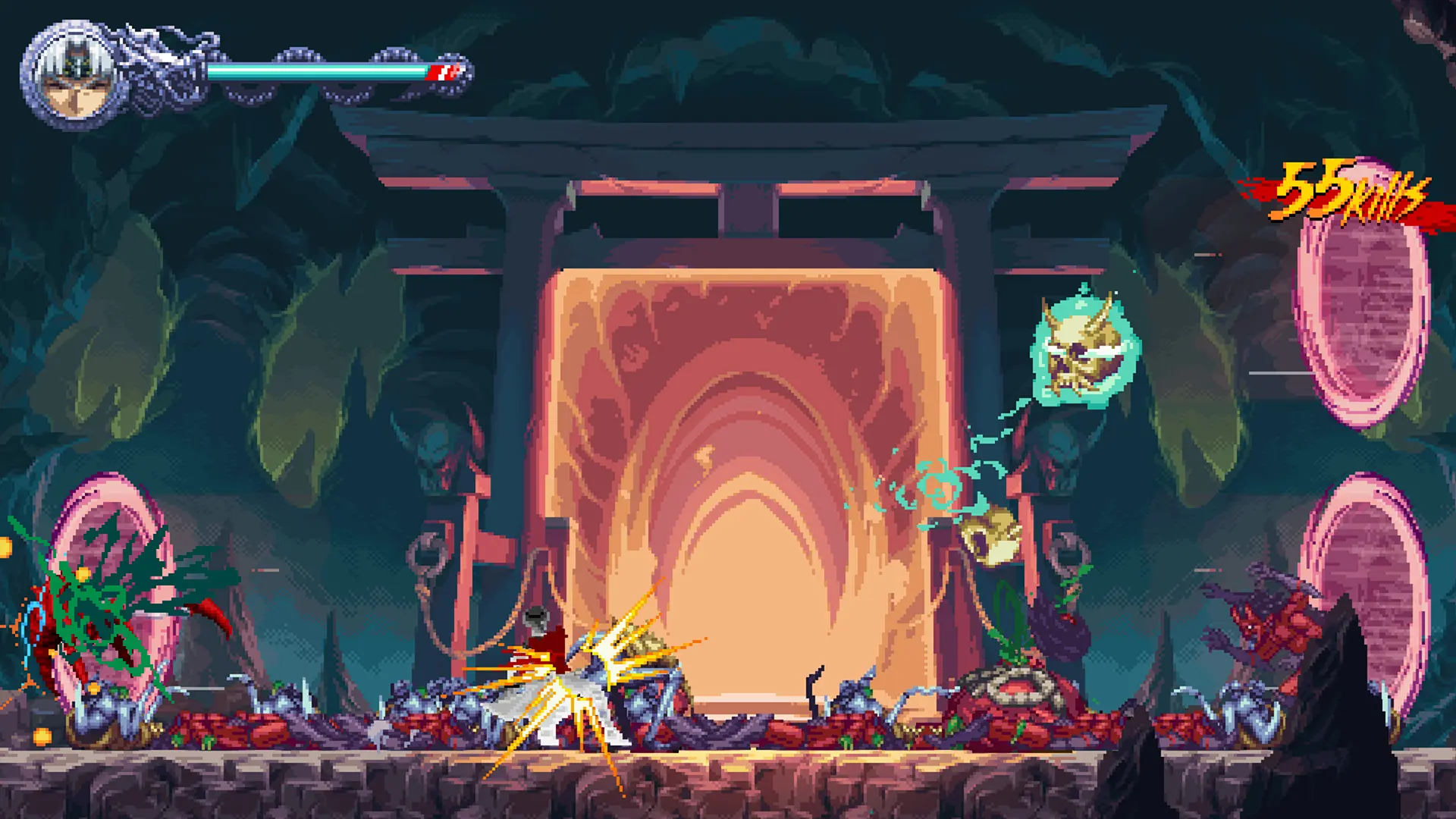 Es importante decir que esto no es Blasphemous. Ni es un metroidvania, ni la jugabilidad tiene mucho que ver, aunque pueda parecerlo. Ragebound está enfocado a la velocidad y a la precisión, y te invita a correr y matar. A veces, incluso, parece más un juego “run ‘n’ gun”, porque puedes valerte de los kunais y otras habilidades para acabar con los enemigos a distancia.