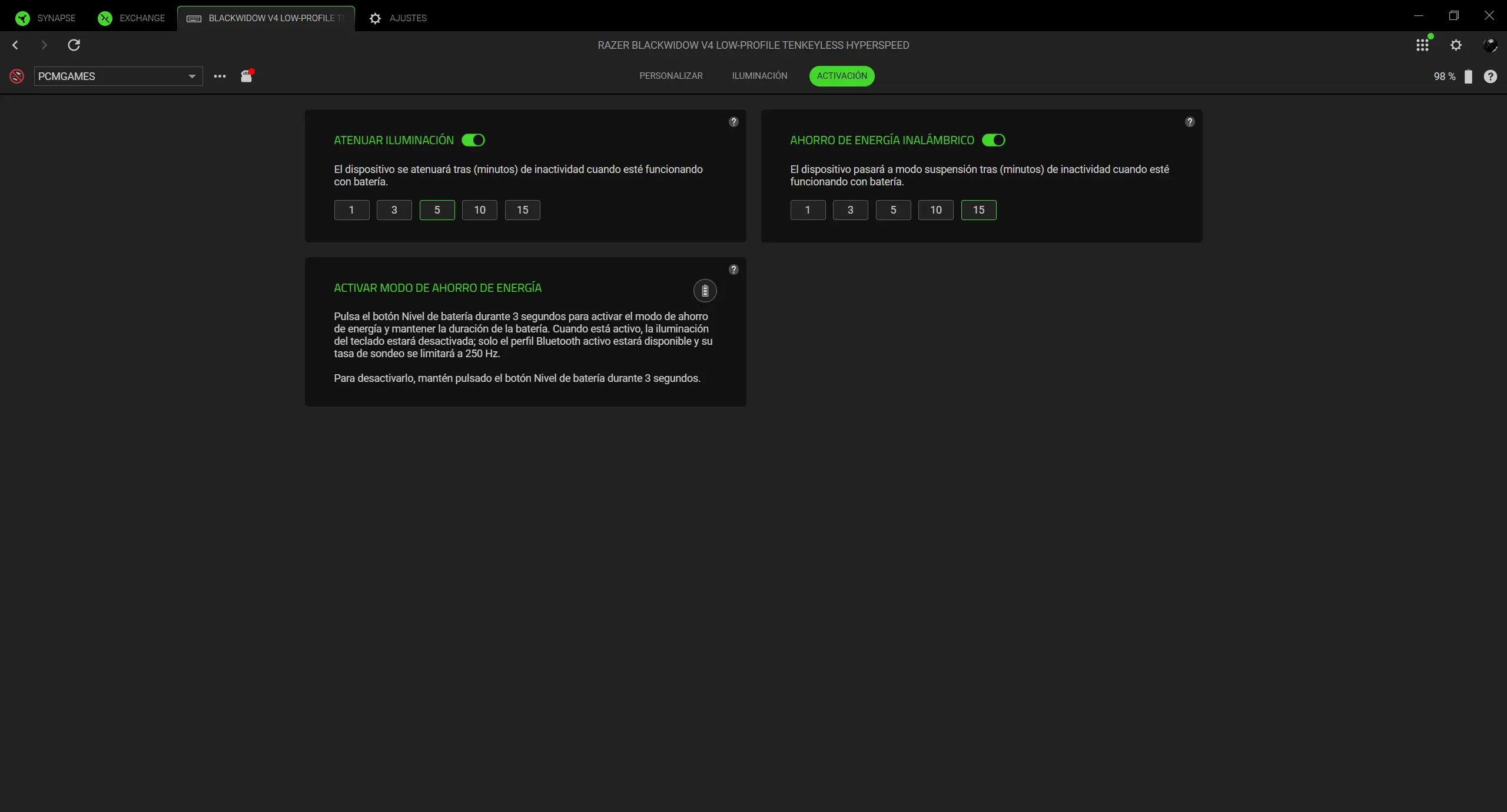 Uno de los puntos más llamativos es la batería, capaz de alcanzar hasta 980 horas en modo de ahorro de energía. En este estado, el teclado ajusta la tasa de sondeo, desactiva la iluminación y pausa la conexión con Synapse para alargar al máximo la autonomía, sin perder la funcionalidad básica de las teclas.